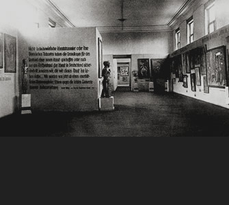 Werke u. a. von Otto Dix, Ernst Ludwig Kirchner und Max Ernst neben einem Zitat von Hitler